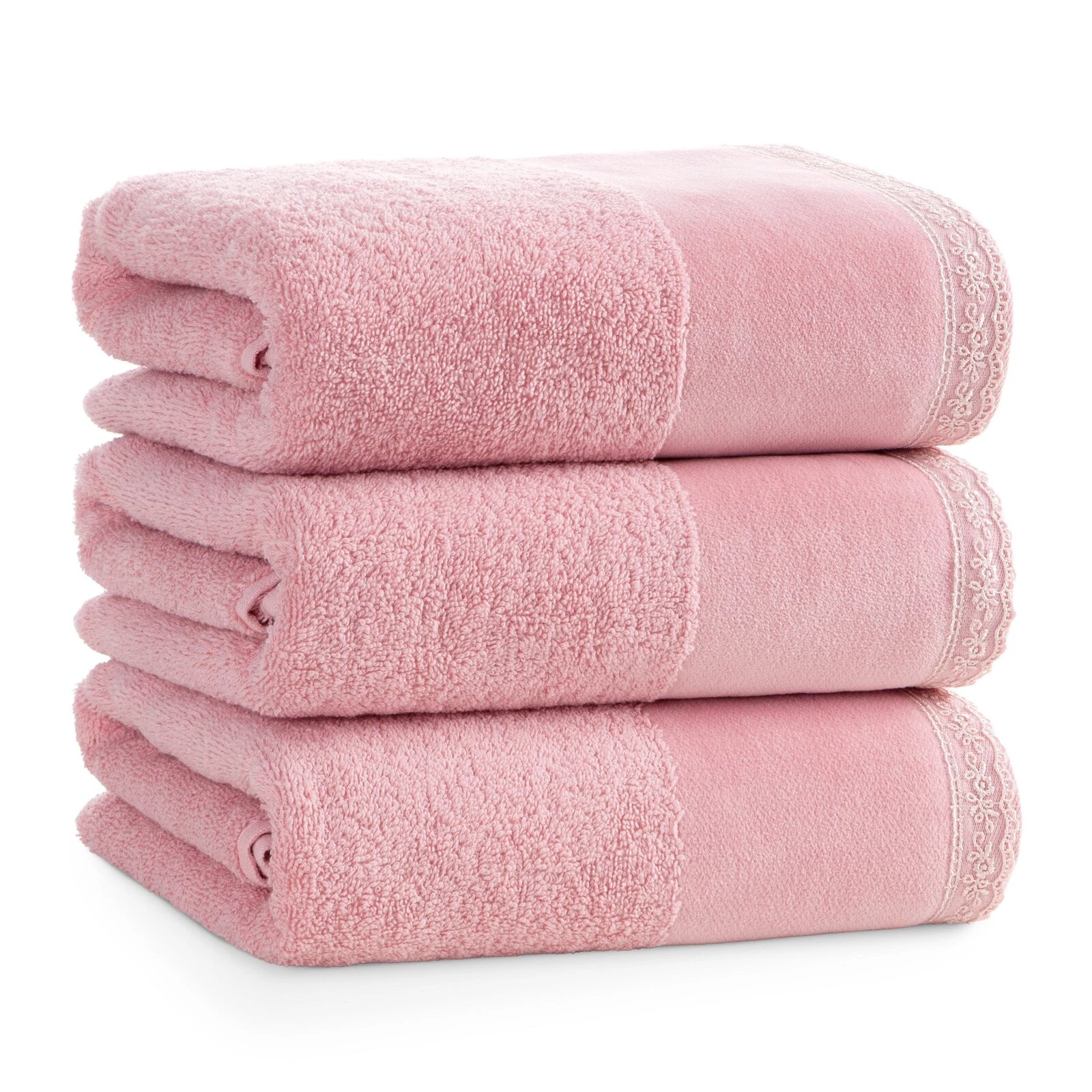 - Piękny ręcznik kąpielowy z miękkiej i chłonnej bawełny frotte zdobiony na bordiurze aplikacją w formie serduszek wypełnionych różyczkami. Doskonały na prezent. szerokość: 50 cm, długość: 90 cm, kolor: różowy, Gramatura: 500 GSM, Skład: 100% bawełna; część