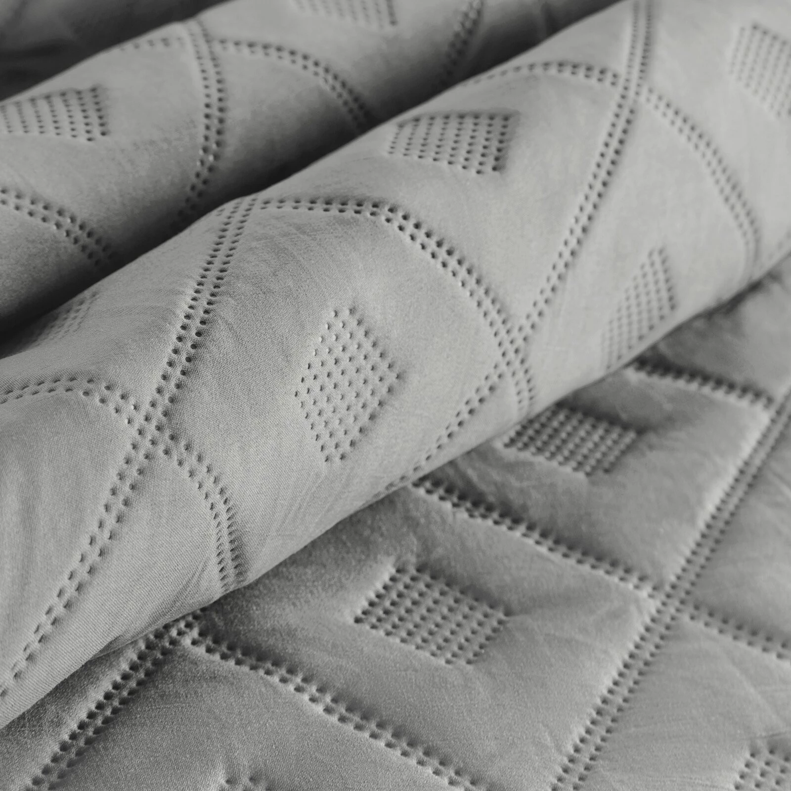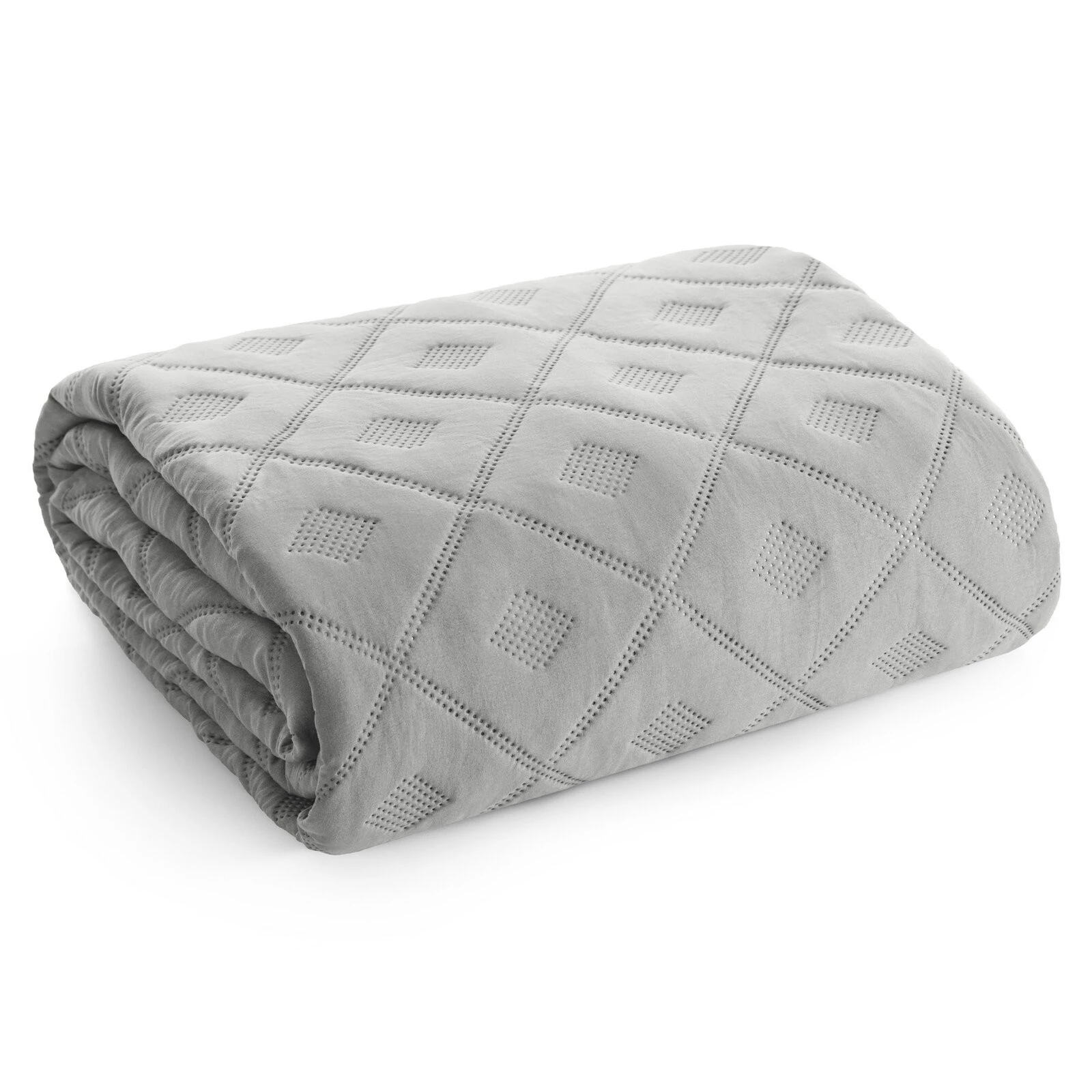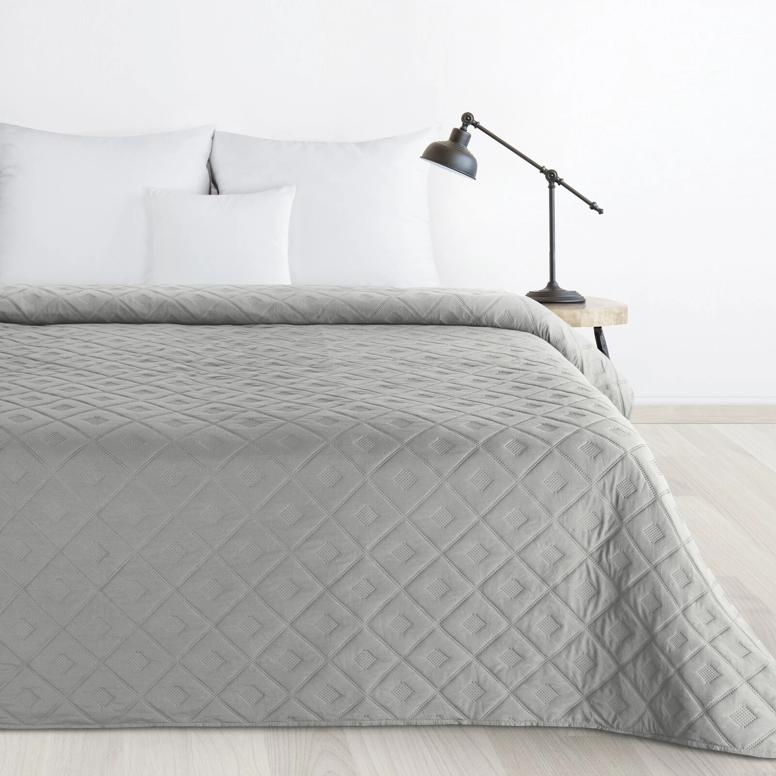 - Narzuta jednokolorowa, wykonana techniką hot press szerokość: 220 cm, długość: 240 cm, kolor: srebrny, Gramatura: 85 GSM, Skład: 100% poliester