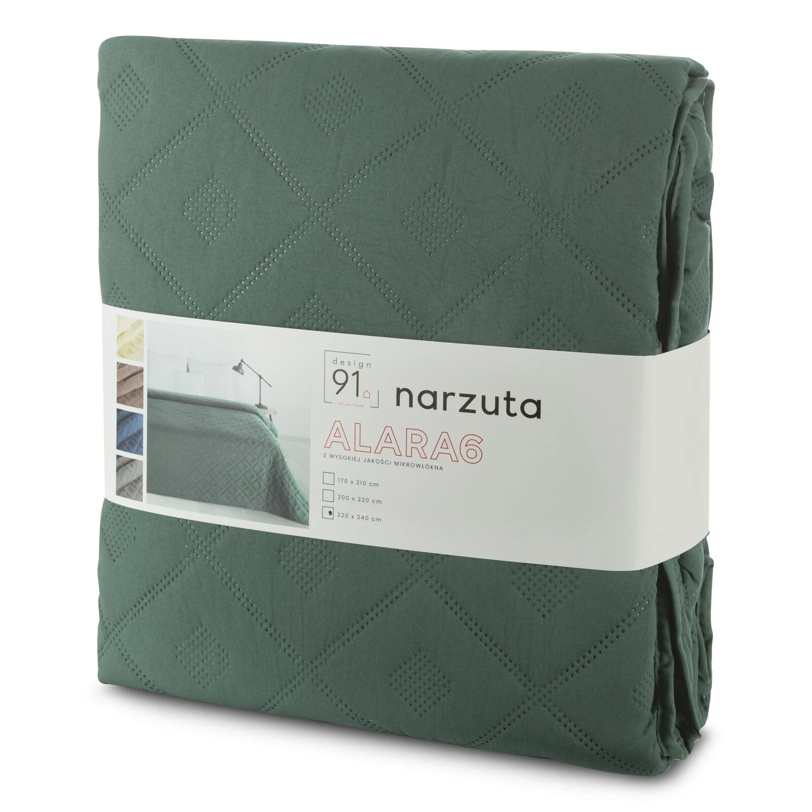 - Narzuta jednokolorowa, wykonana techniką hot press szerokość: 220 cm, długość: 240 cm, kolor: zielony, Gramatura: 85 GSM, Skład: 100% poliester