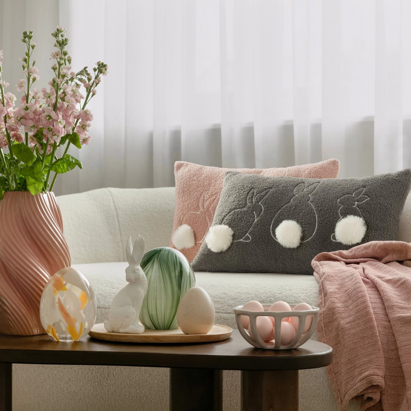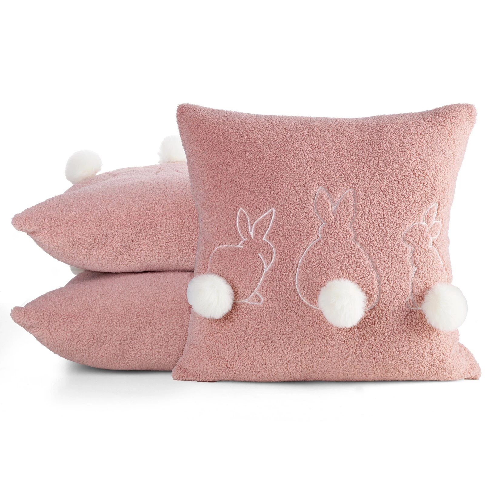 - Wielkanocna poszewka dekoracyjna imitująca buklę z ozdobnymi pomponami szerokość: 45 cm, długość: 45 cm, kolor: pudrowy, Gramatura: 220 GSM, Skład: 100% poliester