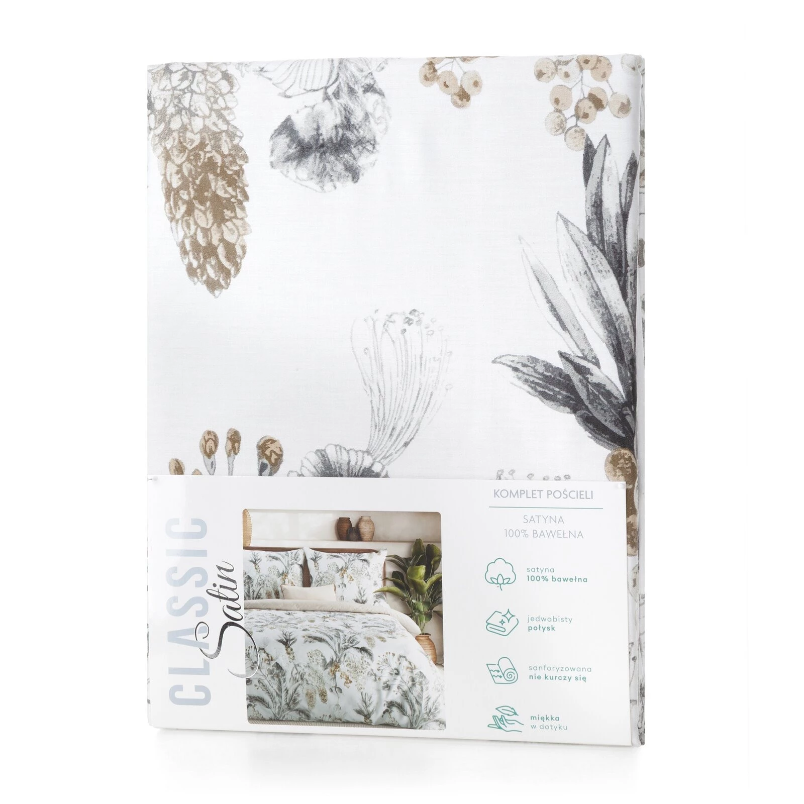 - Komplet pościeli z satyny bawełnianej z nadrukiem szerokość: 220 cm, długość: 200 cm, kolor: biały, Gramatura: 115 GSM, Skład: satyna, 100% bawełna
