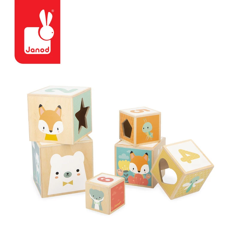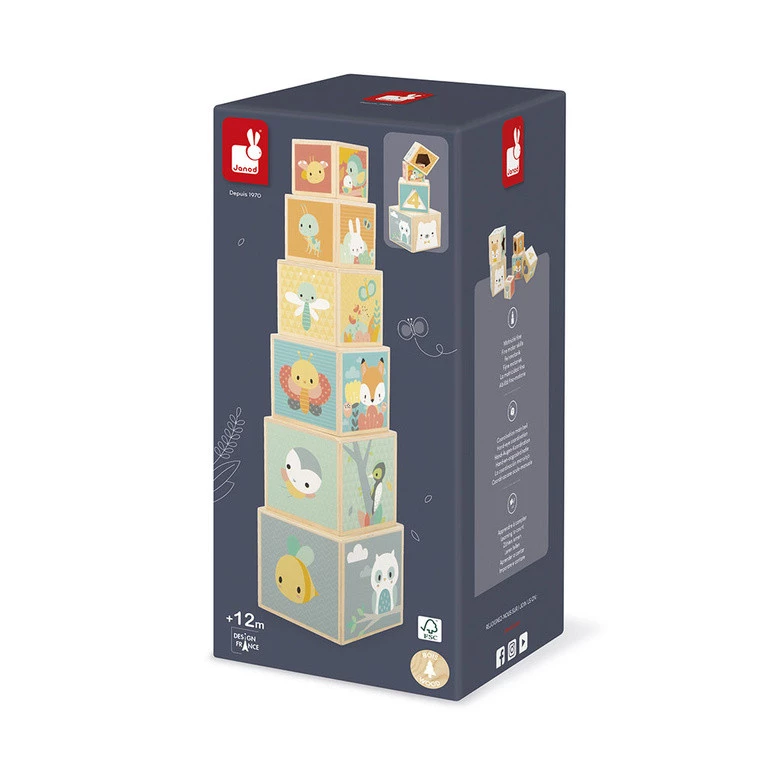 Układanka drewniana piramida-wieża z serii Pure francuskiej marki JANOD to kreatywna zabawka dla dzieci od 1. roku życia. Składa się z 6 klocków – sześcianów różnej wielkości, dzięki czemu można je układać jeden na drugim lub chować jeden wewnątrz drugiego. Klocki są poręczne i ciekawie ilustrowane postaciami zwierząt czy kolejnymi cyferkami. Mają także otwory w różnych geometrycznych kształtach. Układanka pomaga zrozumieć pojęcie rozmiarów i sekwencji, liczyć, rozróżniać kolory i figury, ćwiczyć chwyt i koncentrację. Zabawka zaprojektowana została we Francji. Jest zapakowana w estetyczne kartonowe pudełko. Idealnie nadaje się na prezent.