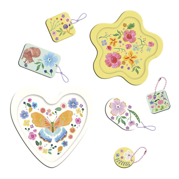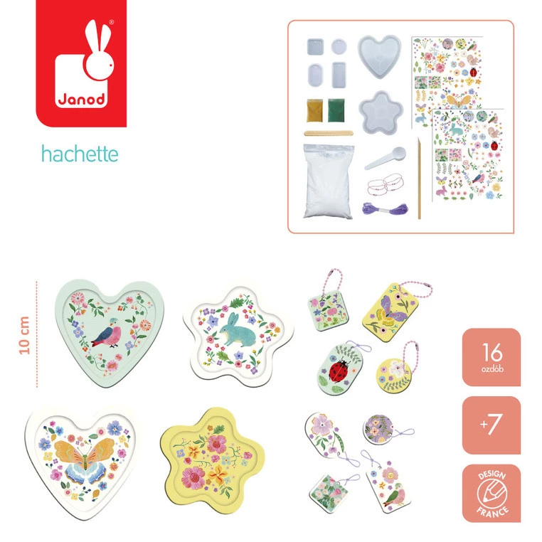 Zestaw do stworzenia gipsowych dekoracji Ogród francuskiej marki JANOD pozwoli stworzyć łącznie 16 ozdób: 4 ozdobne spodeczki i 12 breloczków. W jego skład wchodzi 300 g proszku (gipsowego) do wymieszania z wodą, 2 saszetki pigmentów w proszku (żółty i zielony), 1 miarka, 1 drewniany patyczek i 1 drewniana szpatułka, 2 duże (kwiat i serce) oraz 4 małe silikonowe foremki, 2 arkusze ze wzorkami do kalkomanii, 4 łańcuszki kulkowe z zapięciami i 1 nitka. Do zestawu dołączona jest szczegółowa instrukcja, jak krok po kroku wykonać poszczególne ozdoby.