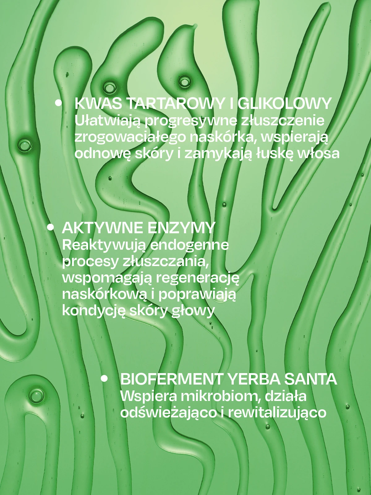 - Kwasowo-enzymatyczny eksfoliator, który oczyszcza skalp, odblokowuje mieszki włosowe i wspiera proces zagęszczania włosów.