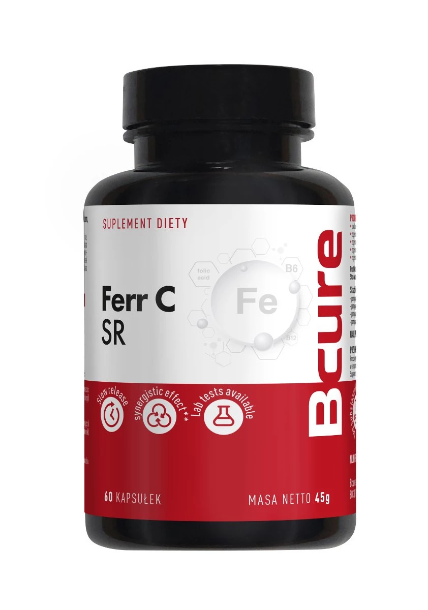 - BCure Ferr C SR to wysokiej jakości suplement diety, który wspiera organizm w dostarczaniu niezbędnych składników odżywczych, takich jak żelazo, witamina C oraz witaminy z grupy B (B6, B9, B12).