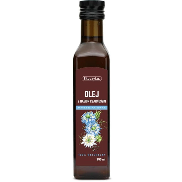 <p><b>NIERAFINOWANY. TŁOCZONY NA ZIMNO.<br></b>Jest doskonałym dodatkiem do sałatek, surówek twarożków, kasz, makaronów, sosów, marynat i innych dań serwowanych na zimno. Dzięki olejowi z czarnuszki potrawy zyskają wyrazisty smak.</p><p><b>Wartość energetyczna: 3429 kJ / 819 kcal<br></b>Tłuszcz 98,4 g<br>w tym kwasy tłuszczowe:<br>- nasycone 11,9 g<br>- jednonienasycone 21,6 g<br>- wielonienasycone 64,9 g<br>Węglowodany 0 g<br>- w tym cukry 0 g<br>Białko 0 g<br>Sól 0 g<br>Błonnik 0 g</p><p><b>PRZECHOWYWANIE:</b><br>Przechowywać w suchym, chłodnym i zaciemnionym miejscu. Po otwarciu przechowywać w lodówce maksymalnie 3 - 4 tygodnie. Olej może zawierać naturalny osad.</p>