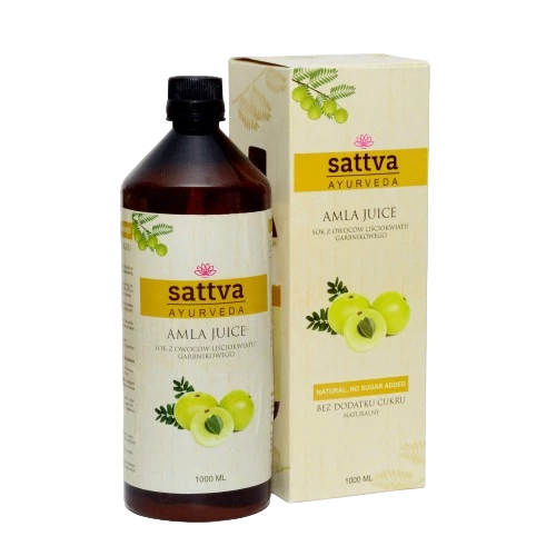- Sok z amli (Emblica officinalis) to tradycyjny składnik ajurwedy, ceniony za swoje właściwości wspomagające trawienie, regularność wypróżnień i zdrową masę ciała. Idealny do codziennego spożywania na czczo – w formie rozcieńczonego napoju.