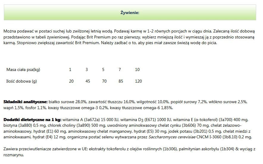 Można podawać w postaci suchej lub zwilżonej letnią wodą. Podawaj karmę w 1-2 równych porcjach w ciągu dnia. Zalecaną ilość dobową przedstawiono w tabeli żywieniowej. Podając Brit Premium po raz pierwszy, wybierz mniejszą ilość i wymieszaj ją z poprzednio stosowaną karmą. Stopniowo zwiększaj zawartość Brit Premium. Należy zadbać o to, aby pies miał zawsze świeżą wodę do picia.