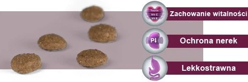 - Specjalny dobór składników pozwala utrzymać właściwy poziom fosforu i tym samym wpływa na prawidłową pracę nerek u starszych kotów, jak również u kotów z przewlekłą niewydolnością nerek.