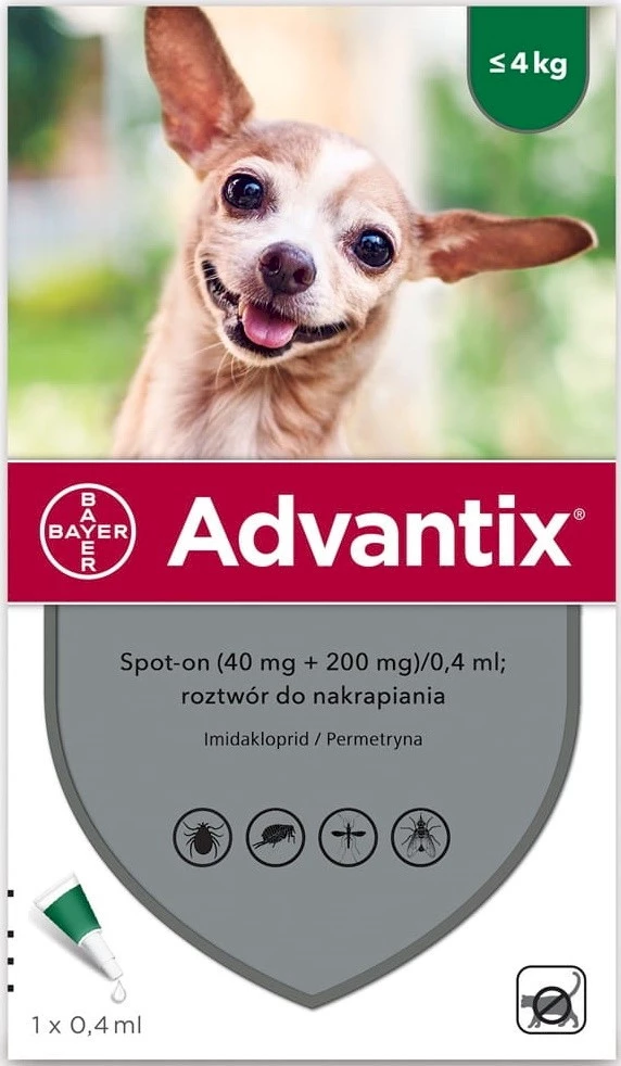 - Advantix SPOT-ON - roztwór do nakrapiania na skórę przeznaczony do zwalczanie kleszczy, pcheł u psów o masie do 4kg.