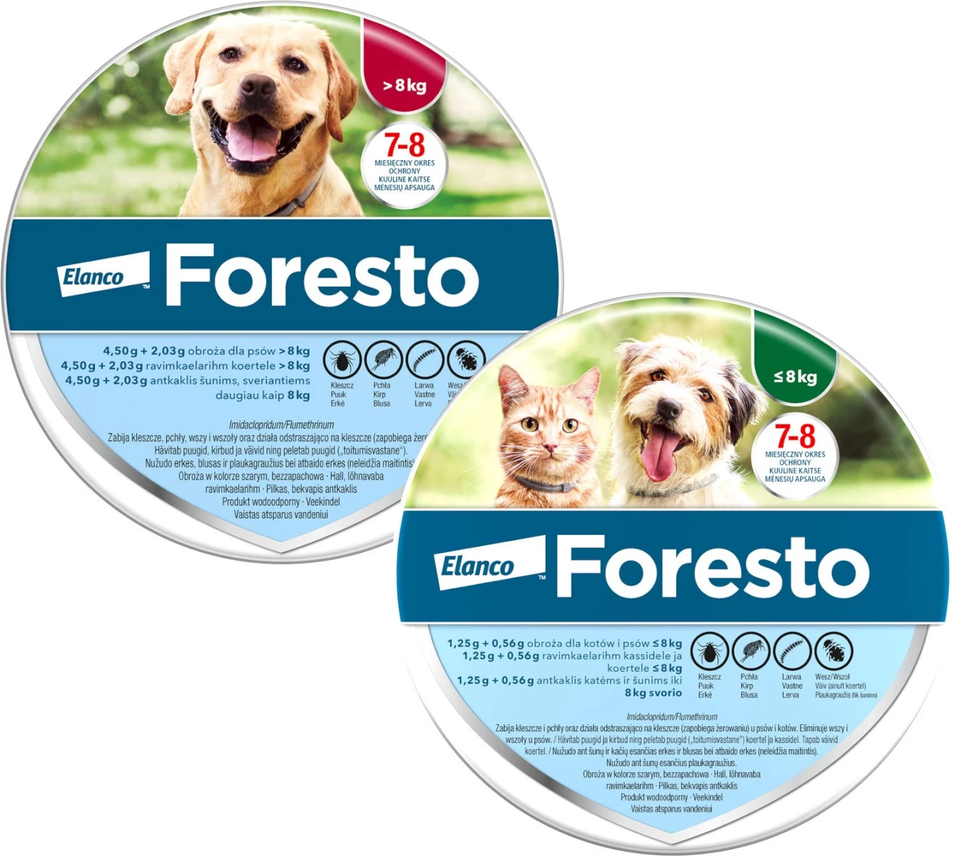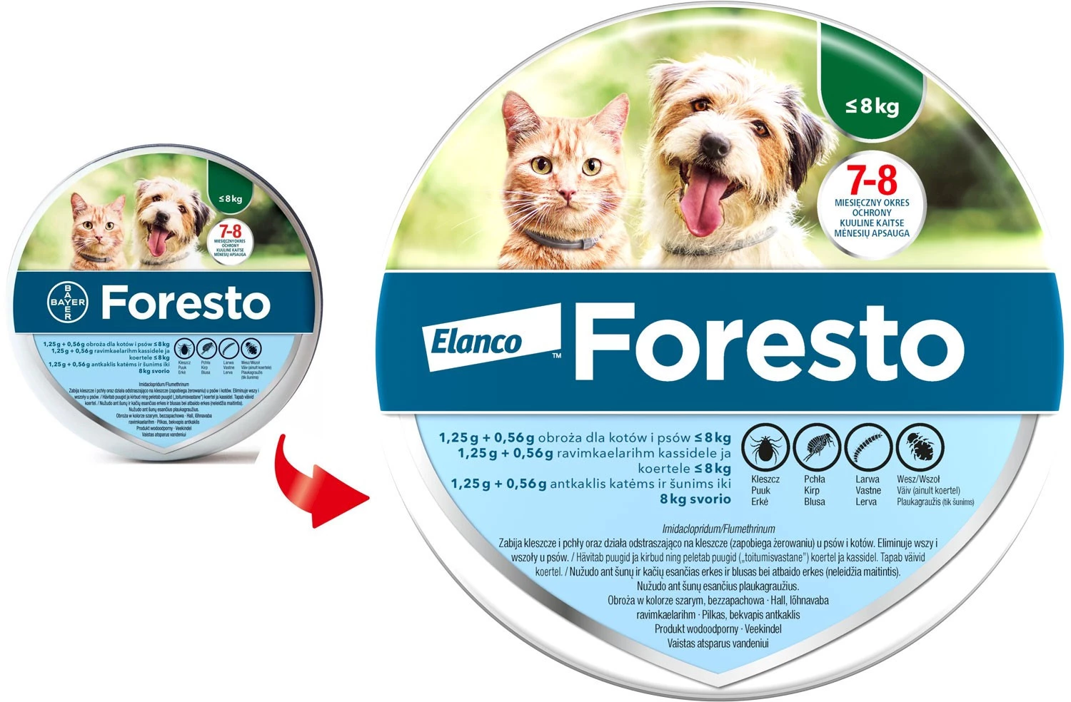 - Obroża Foresto - zwalcza i zapobiega inwazji pcheł, kleszczy, wszy, larw u kotów i psów o wadze do 8kg.
