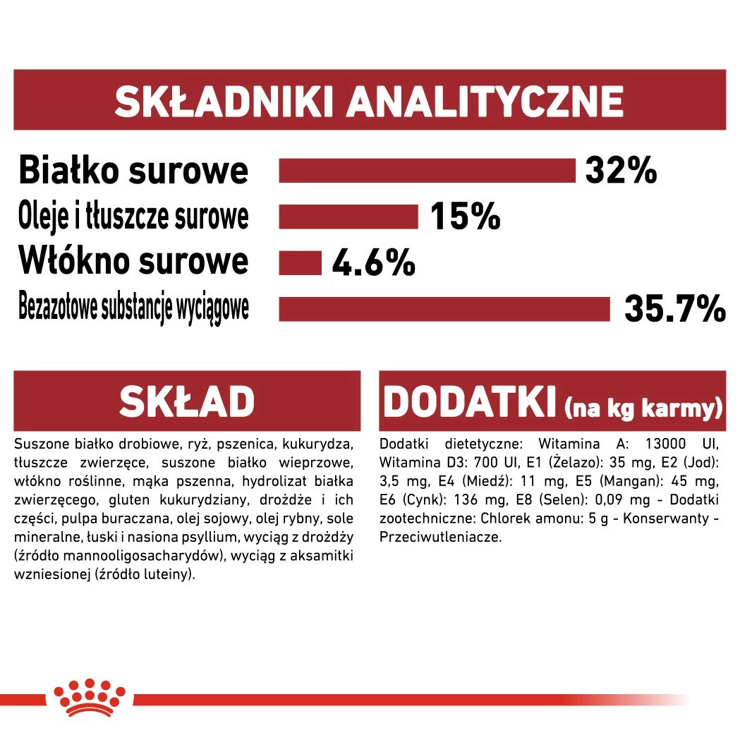 suszone białko drobiowe, ryż, pszenica, kukurydza, tłuszcze zwierzęce, suszone białko wieprzowe*, włókno roślinne, mąka pszenna, hydrolizat białka zwierzęcego, gluten kukurydziany, drożdże i ich części, pulpa buraczana, olej sojowy, olej rybny, sole mineralne, łuski i nasiona psyllium, wyciąg z drożdży (źródło mannooligosacharydów), wyciąg z aksamitki wzniesionej (źródło luteiny).
