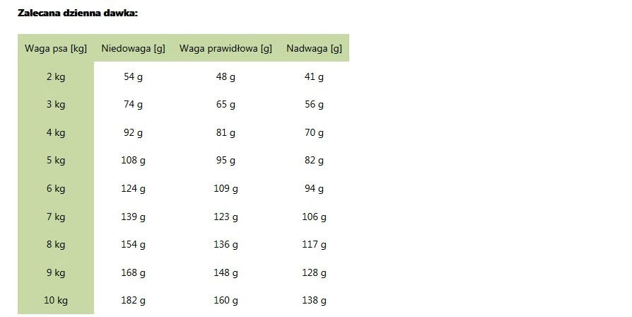 | Waga psa [kg] | Niedowaga [g] | Waga prawidłowa [g] | Nadwaga [g] |