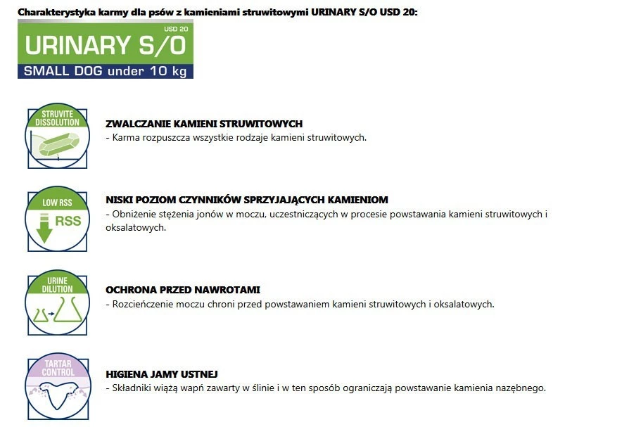 Charakterystyka karmy dla psów z kamieniami struwitowymi URINARY S/O USD 20: