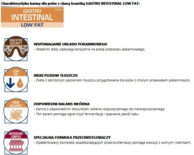 Charakterystyka karmy dla psów z chorą trzustką GASTRO INTESTINAL LOW FAT: