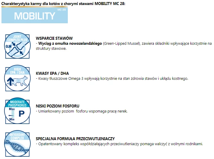 Charakterystyka karmy dla kotów z chorymi stawami MOBILITY MC 28: