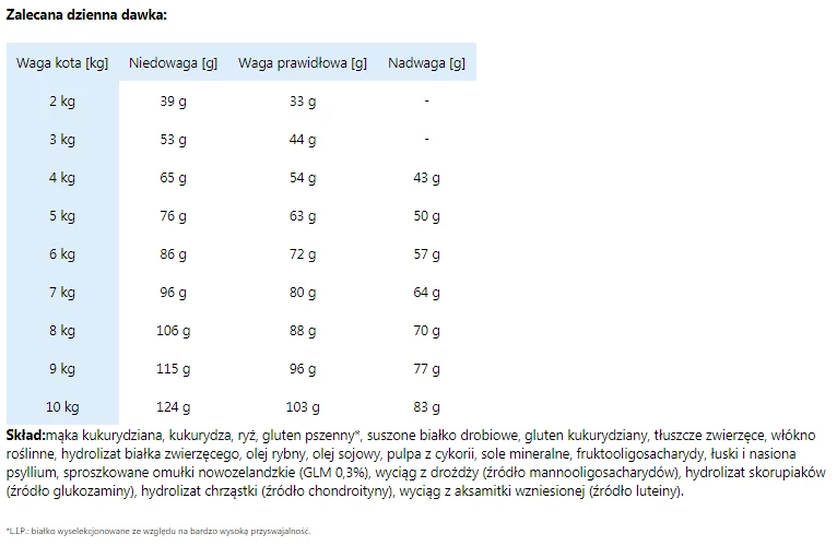 Skład:mąka kukurydziana, kukurydza, ryż, gluten pszenny*, suszone białko drobiowe, gluten kukurydziany, tłuszcze zwierzęce, włókno roślinne, hydrolizat białka zwierzęcego, olej rybny, olej sojowy, pulpa z cykorii, sole mineralne, fruktooligosacharydy, łuski i nasiona psyllium, sproszkowane omułki nowozelandzkie (GLM 0,3%), wyciąg z drożdży (źródło mannooligosacharydów), hydrolizat skorupiaków (źródło glukozaminy), hydrolizat chrząstki (źródło chondroityny), wyciąg z aksamitki wzniesionej (źródło luteiny).
