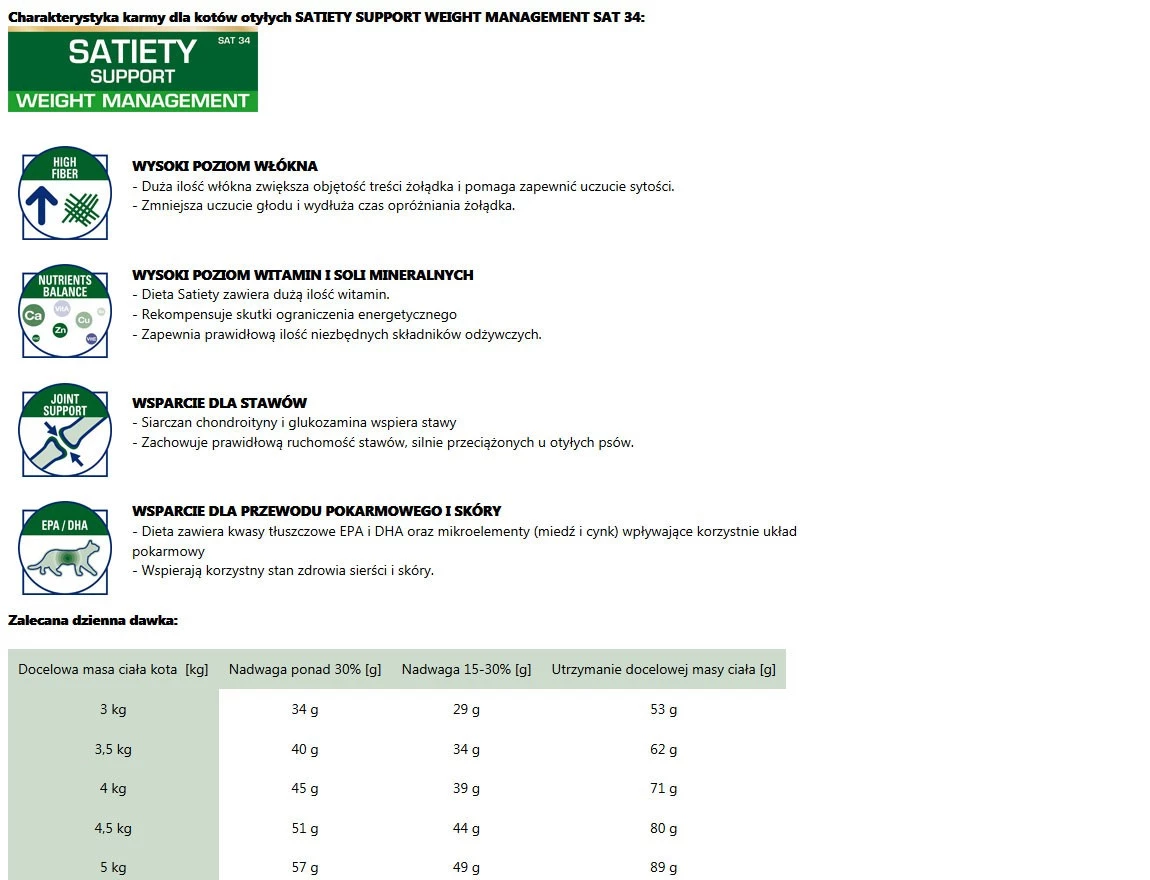Charakterystyka karmy dla kotów otyłych SATIETY SUPPORT WEIGHT MANAGEMENT SAT 34: