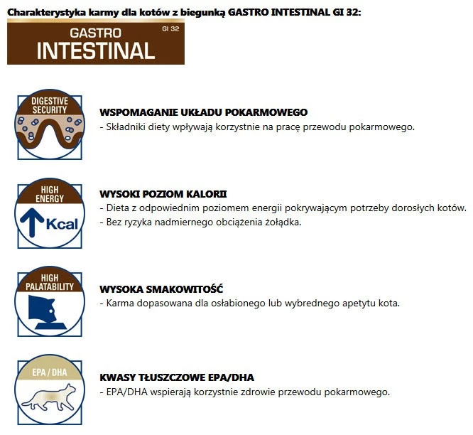 Charakterystyka karmy dla kotów z biegunką GASTRO INTESTINAL GI 32: