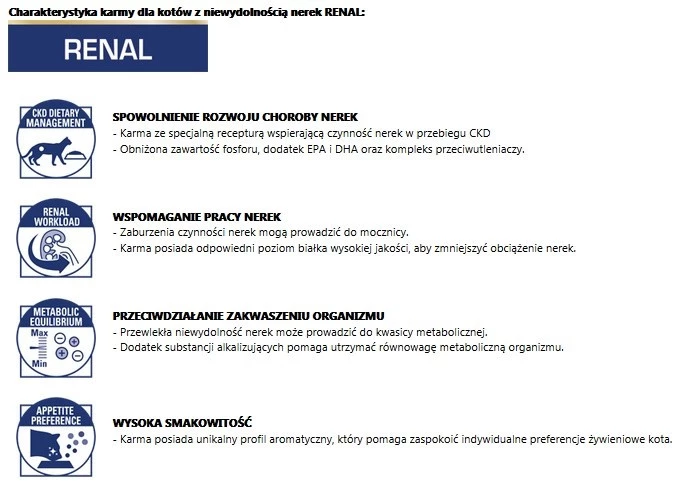 Charakterystyka karmy dla kotów z niewydolnością nerek RENAL: