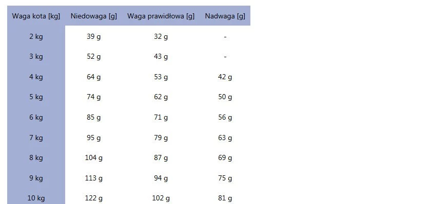 Waga kota [kg] | Niedowaga [g] | Waga prawidłowa [g] | Nadwaga [g] |