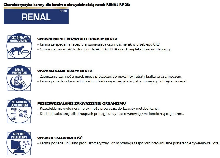 Charakterystyka karmy dla kotów z niewydolnością nerek RENAL RF 23: