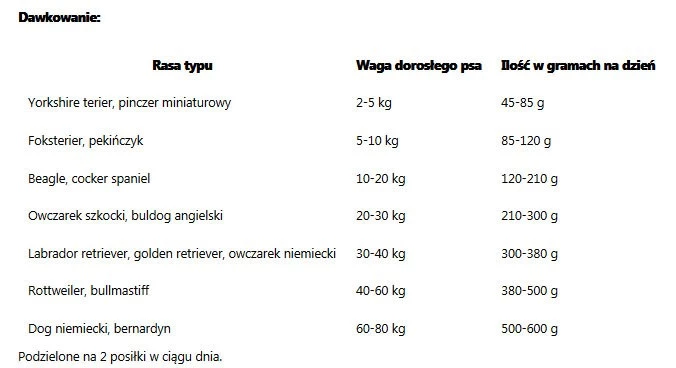 Rasa typu | Waga dorosłego psa | Ilość w gramach na dzień |