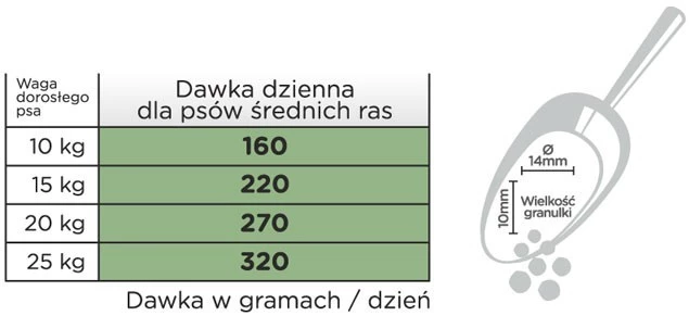 - Kompletna, zbilansowana karma specjalnie opracowana dla metabolizmu psów średnich ras (10-25kg wagi).