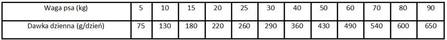 - Dzienna dawka może się różnić w zależności od środowiska, aktywności i wieku Twojego psa.