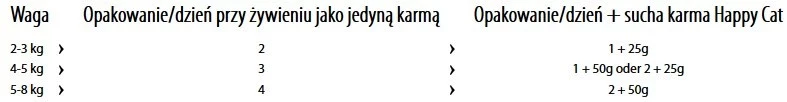 - Jedząc naszą mokrą karmą Happy Cat w postaci mięsnych kąsków na pasztecie, twój koci przyjaciel może zacząć od zlizywania pysznego pasztetu i dalej przejść do smakowitych, mięsnych kawałków. Po obróceniu opakowania i przełożeniu karmy do miseczki mięsne kąski znajdą się na samym dole przykryte delikatnym musem.