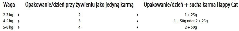 - Jedząc naszą mokrą karmą Happy Cat w postaci mięsnych kąsków na pasztecie, twój koci przyjaciel może zacząć od zlizywania pysznego pasztetu i dalej przejść do smakowitych, mięsnych kawałków Po obróceniu opakowania i przełożeniu karmy do miseczki mięsne kąski znajdą się na samym dole przykryte delikatnym musem.