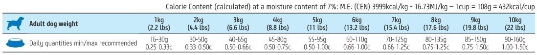 Białko surowe 34%, oleje i tłuszcze surowe 18%, Włókno surowe 2.60%; wilgotność 9.00%; Popiół surowy 7.90%; Wapń 1.00%; Fosfor 0.80%; Omega-6 3.30%; Omega-3 0.90%; DHA 0.50%; EPA 0.30%; Glukozamina 1200mg/kg; Siarczan Chondroityny 900mg/kg.
