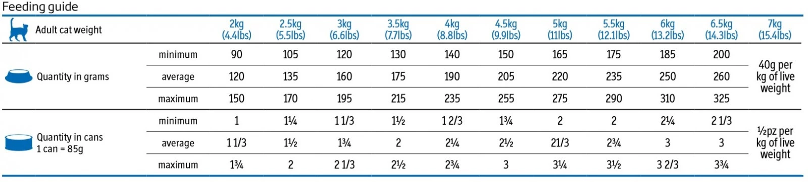 Białko surowe 10,2%, oleje i tłuszcze surowe 5,7%, włókno surowe 0,30%; popiół surowy 2,40%; wilgotność 75,00%; wapń 0,19%; fosfor 0,17%; sód 0,30%; potas 0,20%; magnez 0,019%; chlorki 0,35%; siarka 0,2%; tauryna 0,15%. Wartość energetyczna: EM 1066kcal/kg – 4.46MJ/kg.