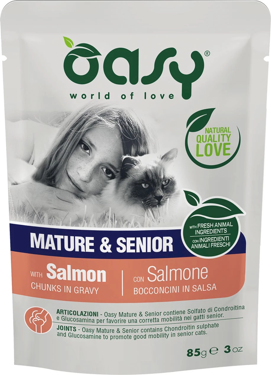 Cechy karmy w saszetce OASY Lifestage Mature & Senior with Salmon Chunks in Gravy: |