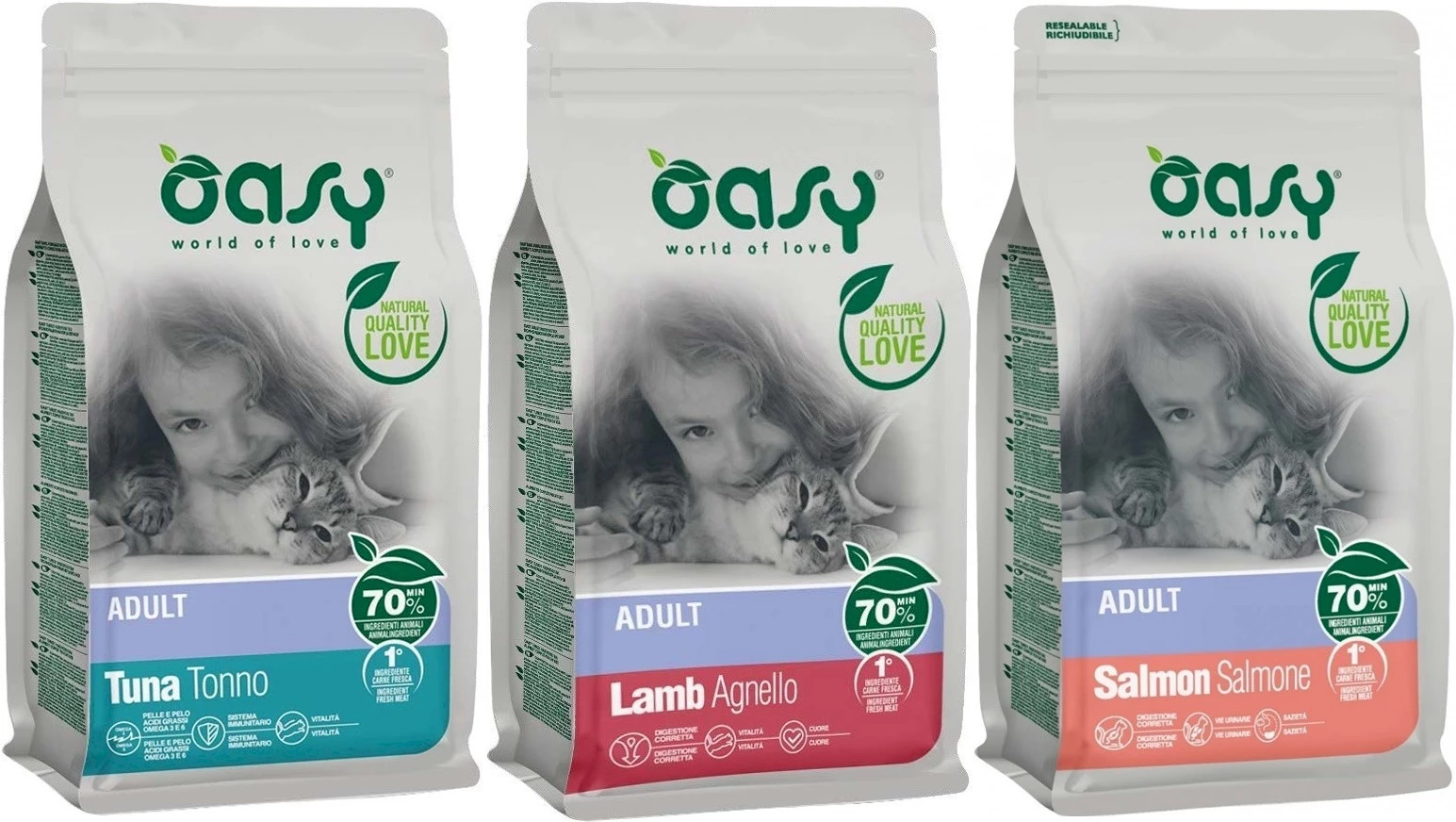 - Oasy oferuje szeroką gamę pełnowartościowych karm dla kotów, dostępnych w różnych formułach i formatach, opracowanych dla każdego etapu życia i wielkości.