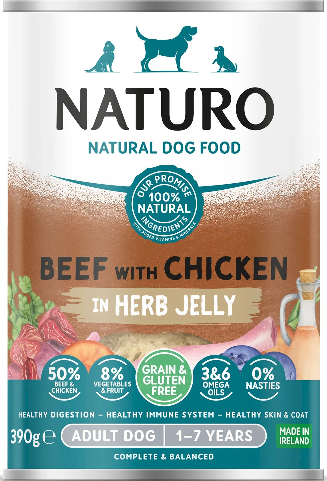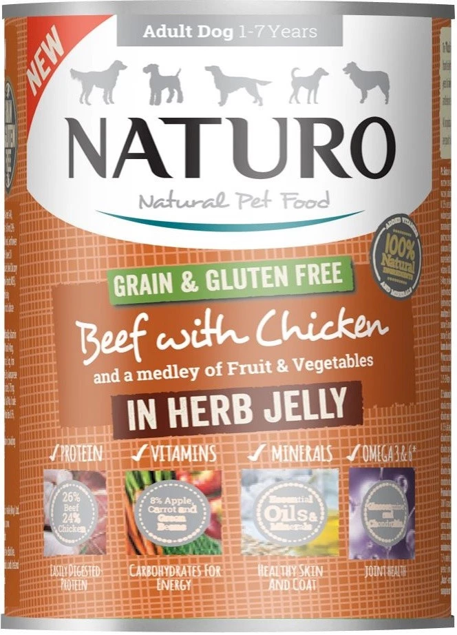 Cechy karmy NATURO Adult Dog Beef with Chicken and Fruit & Vegetables in a Herb Jelly: