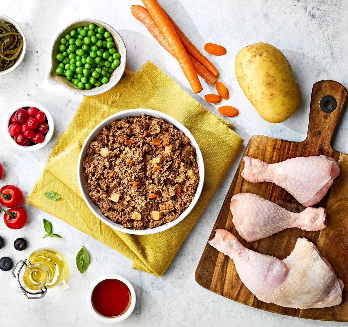 Kurczak 66%, Ziemniak 20% (5,3% z suszonego ziemniaka) Warzywa 7% (2% suszona marchewka i groszek) Minerały, Olej Słonecznikowy 0,75%, Olej Łososiowy 0,3%, Suszony Pomidor, Suszone algi, Suszona bazylia.
