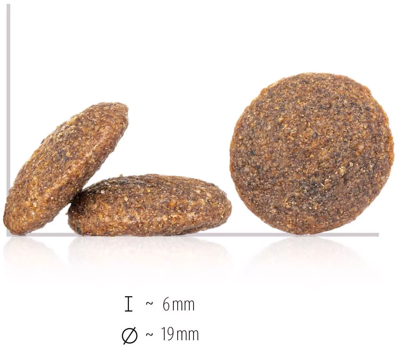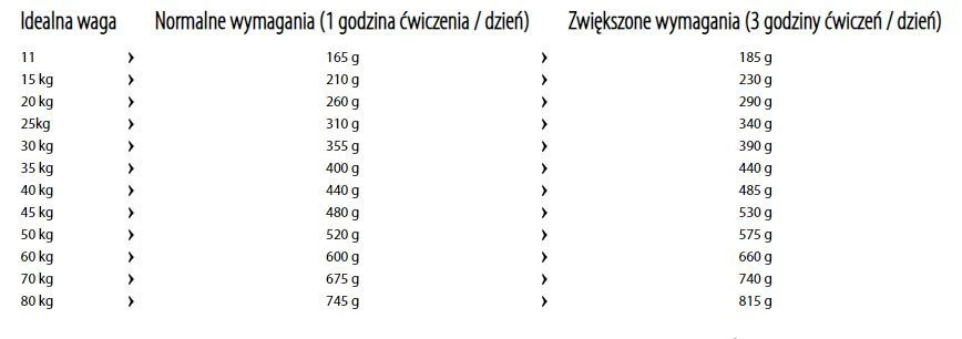 Białko surowe 20.0%, tłuszcz surowy 10.0%, włókna surowe 3,0 %, popiół surowy 7,0 %, wapń 1,25 %, fosfor 0,8 %, sód 0,35 %, kwasy tłuszczowe omega-6 3,5 %, kwasy tłuszczowe omega-3 0,4 %