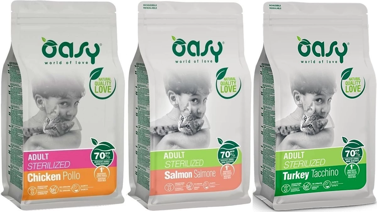 - Oasy oferuje szeroką gamę pełnowartościowych karm dla kotów, dostępnych w różnych formułach i formatach, opracowanych dla każdego etapu życia i wielkości.