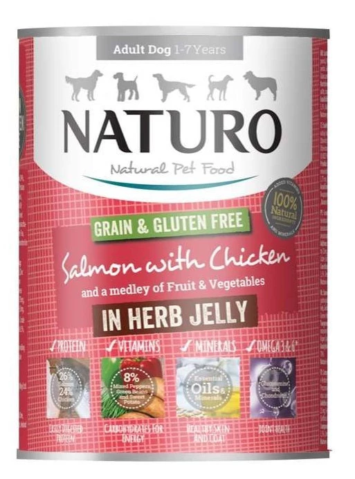 Cechy karmy NATURO Grain & Gluten Free łosoś i kurczak w ziołowej galarecie 390g: