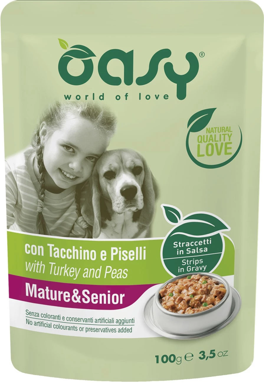 Cechy karmy OASY Mature & Senior Strips in Gravy with Turkey and Peas: |