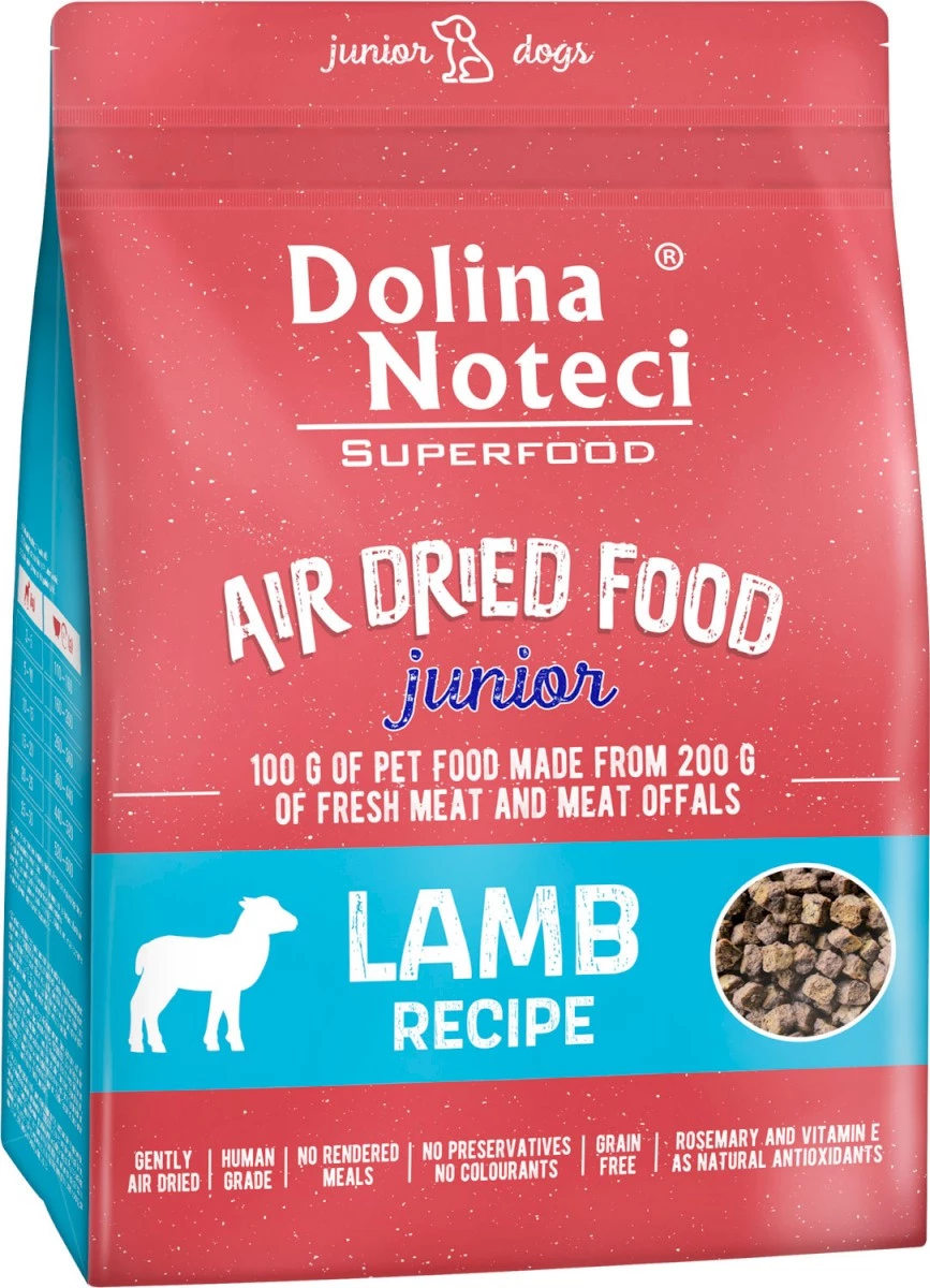 - Karma Dolina Noteci SUPERFOOD danie z jagnięciny jest pełnoporcjową, bytową karmą przeznaczoną do żywienia szczeniąt oraz młodych psów średnich i dużych ras.