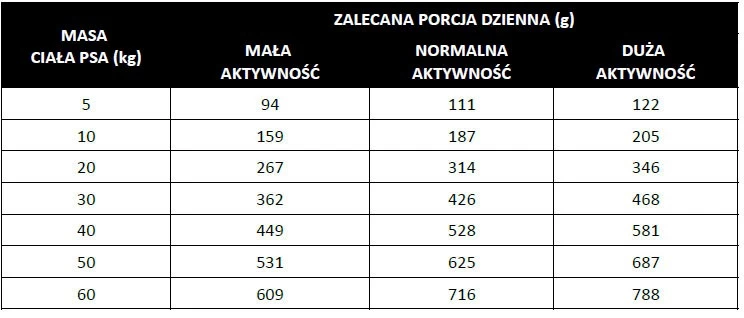 Ilość karmy dopasuj do wieku, masy ciała i aktywności psa. Zawsze zapewnij mu dostęp do świeżej wody.