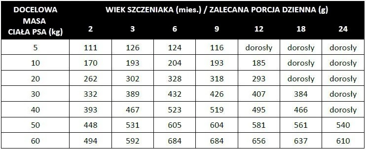 Dzienna porcja zależy od wieku, aktywności i masy ciała szczeniaka. Obserwuj pupila i dostosuj ilość karmy do jego potrzeb. Zawsze zapewnij mu dostęp do świeżej wody.