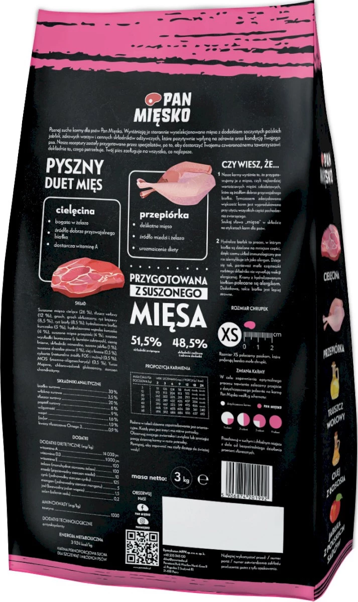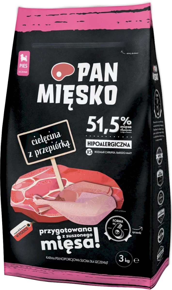 - Pan Mięsko to polska, pełnoporcjowa i hipoalergiczna karma sucha stworzona z najwyższej jakości składników. Opracowana przez specjalistów ds. żywienia zwierząt, zapewnia kompleksowe wsparcie dla zdrowego wzrostu i rozwoju szczeniąt małych ras.