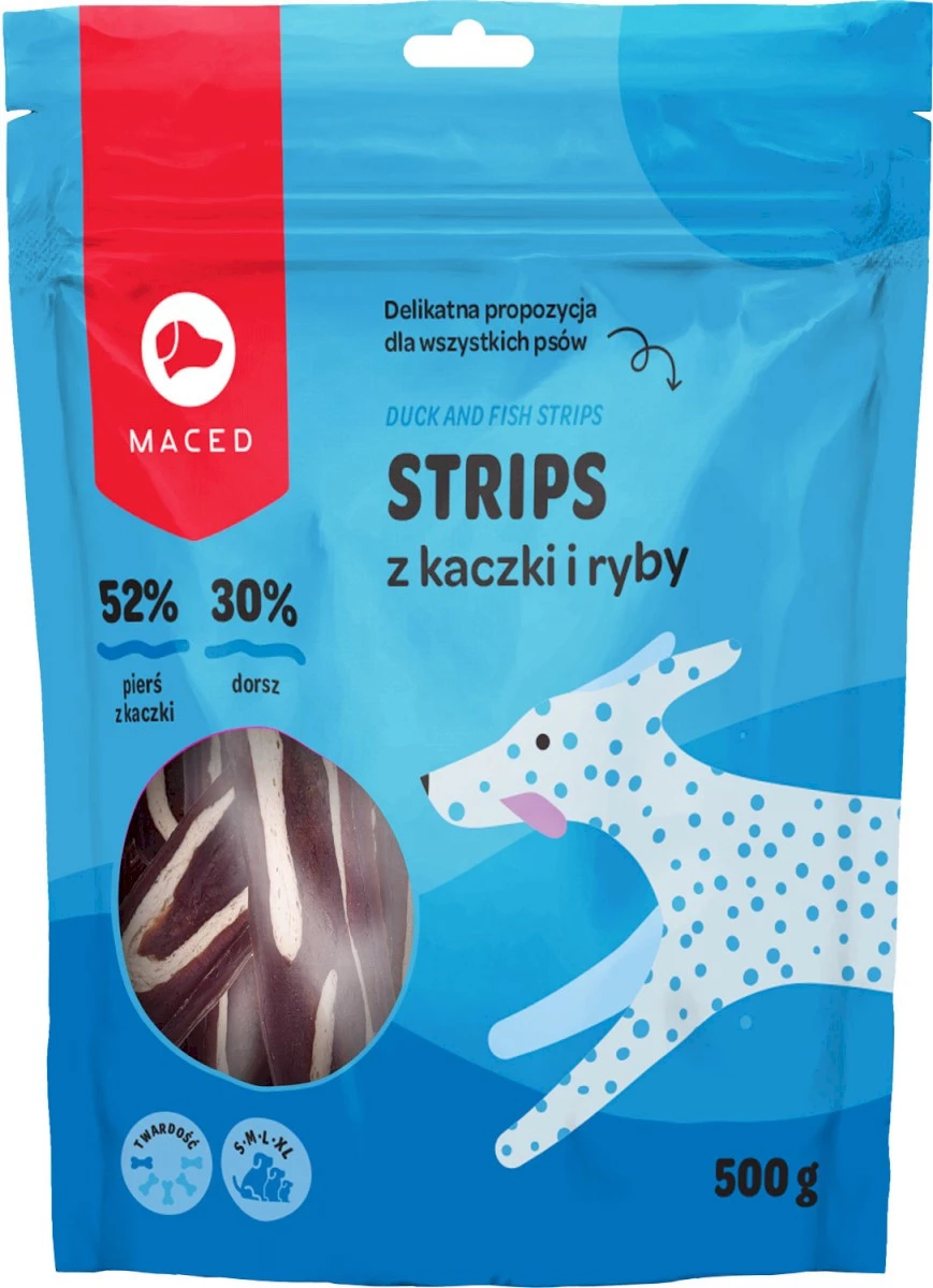 - Przysmak w postaci mięsnych pasków z piersi Kaczki i Dorsza.