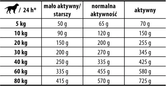 - Niska zawartość tłuszczu w połączeniu z L-karnityną stanowią idealne rozwiązanie dla mało aktywnych i/lub starszych psów.