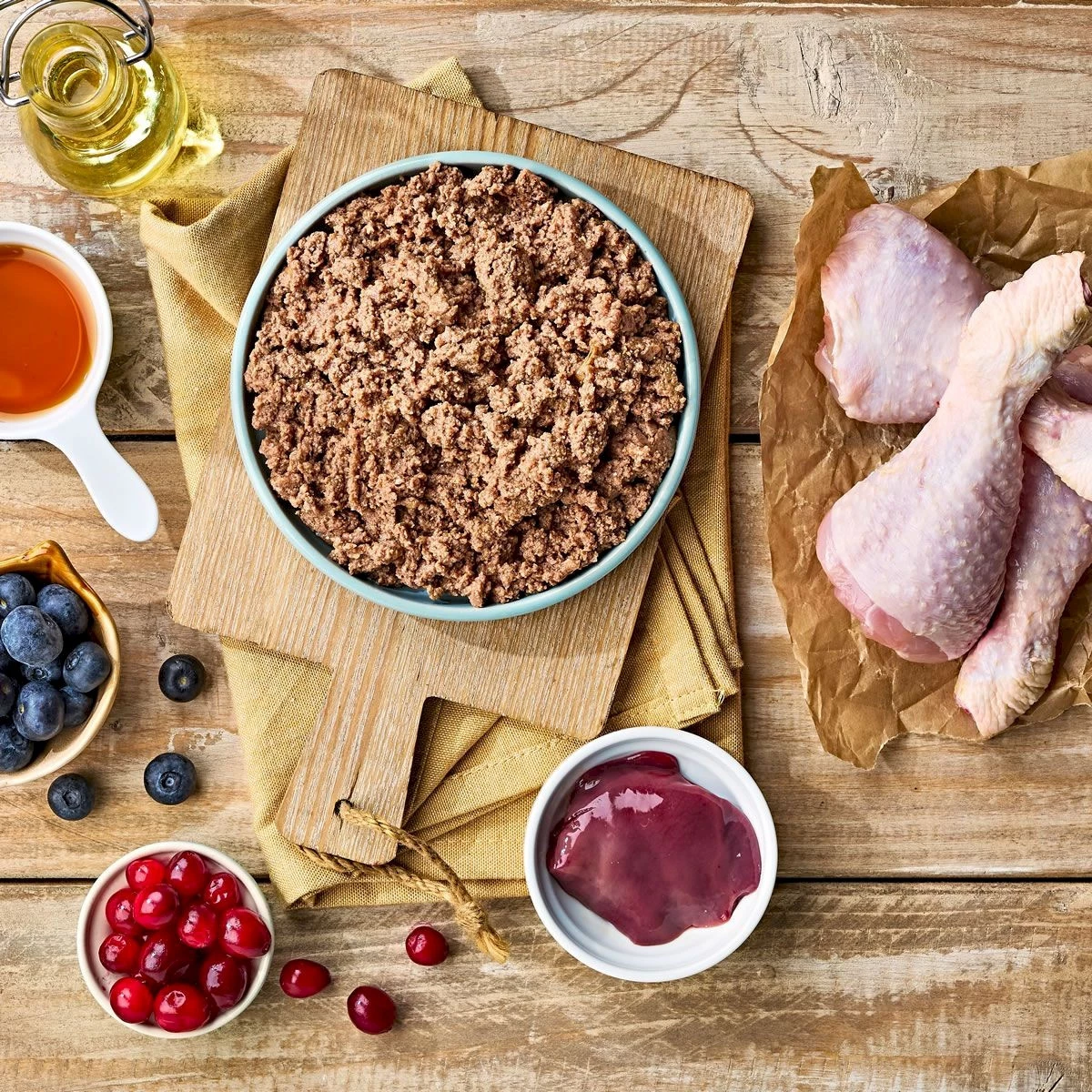 kurczak 40%, wątróbka drobiowa 20%, bulion z kurczaka 10%, minerały, olej z łososia 0,15%, olej słonecznikowy 0,07%, borówka suszona 0,05%, suszona żurawina 0,05%, suszony korzeń cykorii 0,04%,