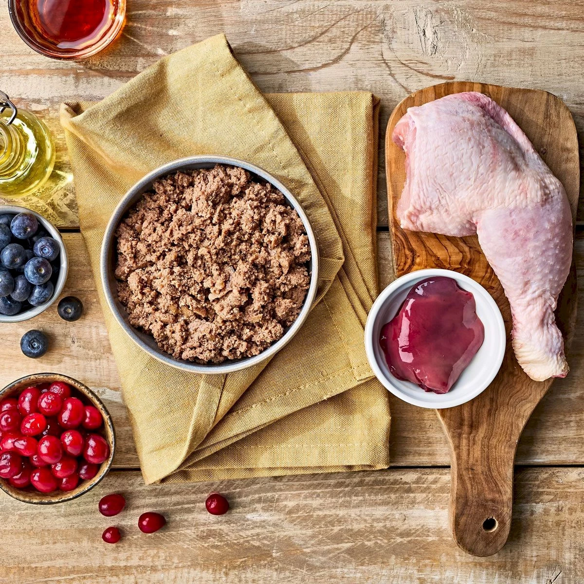 kurczak 50%, wątróbka drobiowa 20%, bulion z kurczaka 10%, minerały, olej z łososia 0,1%, olej słonecznikowy 0,1%, borówka suszona 0,05%, suszona żurawina 0,05%, suszony korzeń cykorii 0,04%,