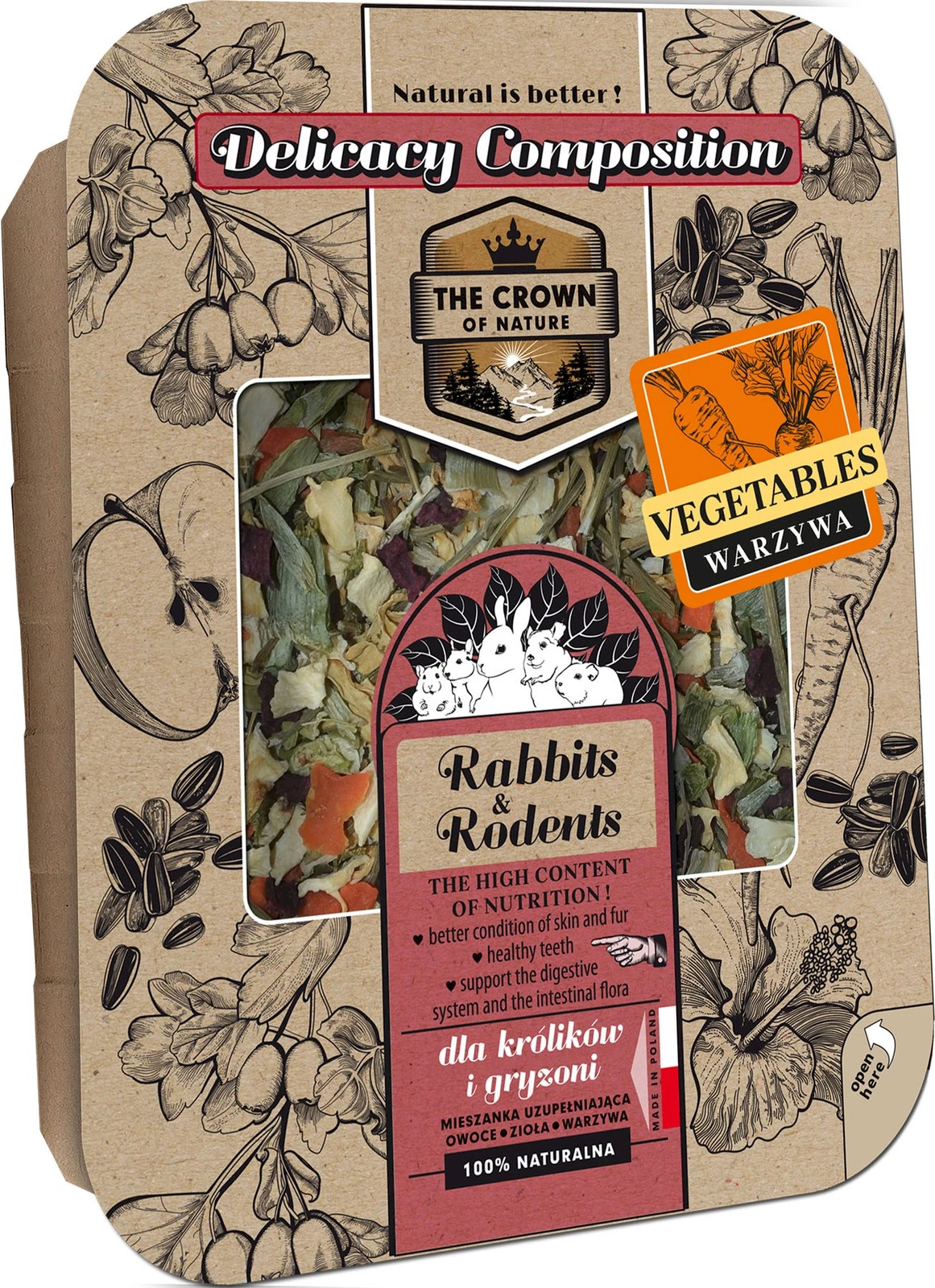 - Kompozycja wyłącznie naturalnych smaków i zapachów zawarta w mieszance suszonych warzyw pozwoli Twojemu pupilowi poczuć się jak w ogrodzie pełnym smakołyków.